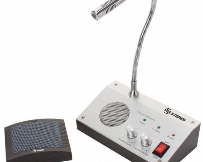 Sistema intercomunicador para ventanillas. El frente o altavoz exterior cuenta con un micrófono para permitir comunicación de dos vías, el intercomunicador interior es un micrófono de cuello flexible multiposición con control de volumen independiente para el exterior e interior. Ideal para bancos, cines y establecimientos comerciales.